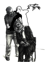 These eclectic paintings from Brazilian painter Khil Vincente in the 29th biannual Sao Paulo created a dilemma and such controversy. His self-portrait of Inimigos who avenges politicians with either fire arms and weapons and/or attack them with insult and contemptuous remarks to get his revenge. The question remains whether the world peace can be reached by elimi- nating the politicians. In this environment, I have created a third party who prevents this blood shed and massacre simply be- cause of the strong conviction that destroy- ing life and killing do NOT resolve our dif- ferences. PEACE in my painting is vividly represented by the messenger of peace, the Dove.