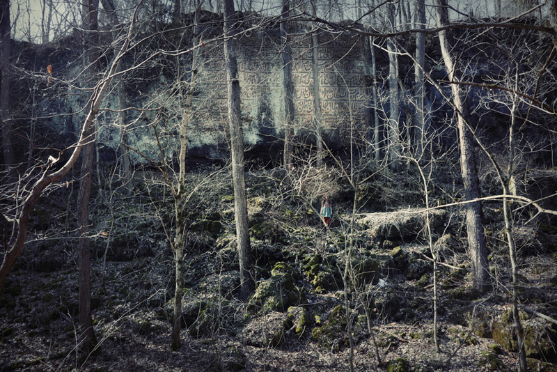 Sublime terrains, composed of magnificent and beautiful elements from a transcultural experience, engulf an isolated figure. The grandiose landscapes are almost believ- able until the multi directional lighting reveals incongruous elements of Middle Eastern architecture and design. The view- er may become curious-like the figure in the photographs, perhaps-as to which com- ponents are real and which are contrived. The doll-like girl’s direct gaze into the camera suggests her desire to explore this otherworldly reality.